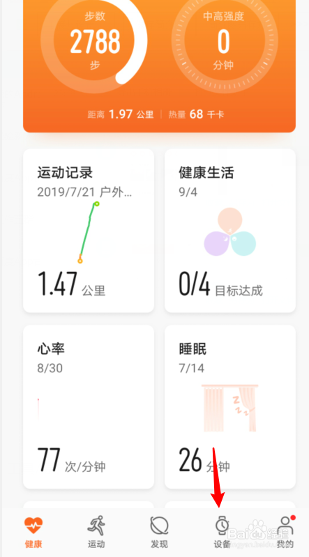 1.打开活动健康应用后,点击右下方设备的选项。