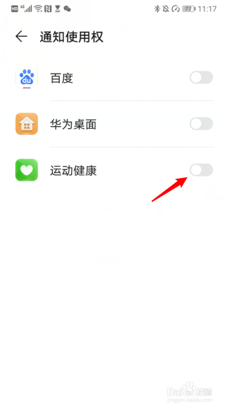 5.在通知利用权界面,点击活动健康的开关。
