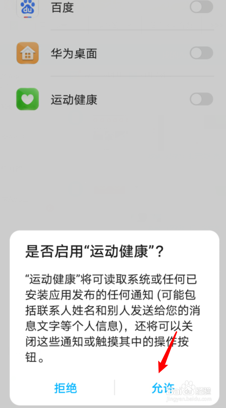 点击后,在通知利用权界面,点击活动健康的开关。