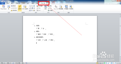打开需要插入复选框的word文件,打开文件中的选项界面。word2010中的开辟东西默认是埋没的,我们需要先打开它,因为复选框控件在开辟东西中。