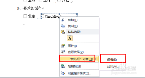 右击“复选框”,在打开的菜单中依次:复选框对象--编纂;这时复选框就处于编纂状况,可对复选框的文字进行点窜。新建的复选框文字都是CheckBox+数字。