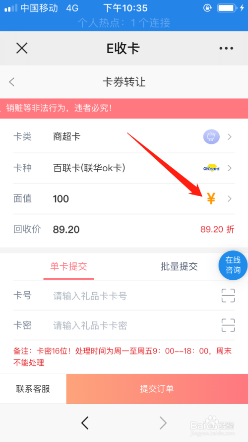 在商超卡菜单中选择百联卡(联华ok卡),然后选择对应的面值,按提醒输入对应的信息选择提交即可,轻松购物卡的收受接管变现。