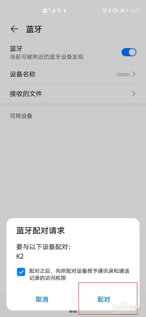 第四步选择搜刮到的设备,点击许可蓝牙配对请求。