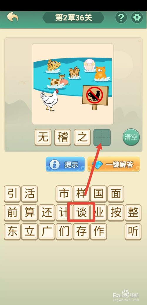 第2章第36关,图中有一只鸡在按上,水里面有各类动物在聊天,故本关当作语为无稽之谈,出自宋·郑樵《通志·总序》;