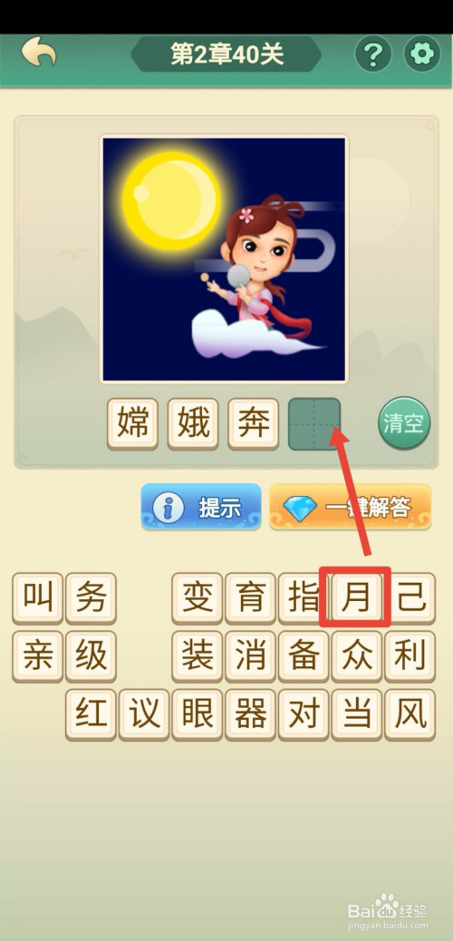 第2章第40关,图中嫦娥奔标的目的了月亮,谜底显而易见,为嫦娥奔月,出自西汉·刘安《淮南子·览冥训》。