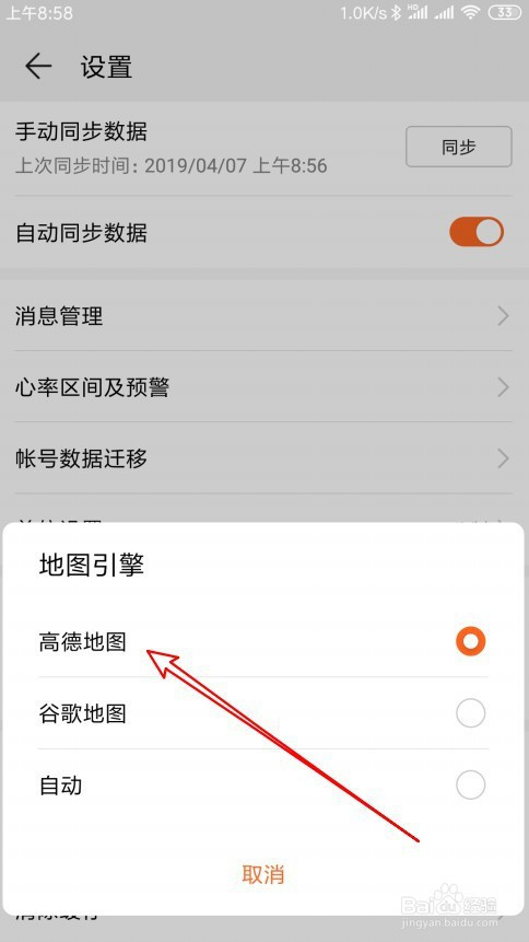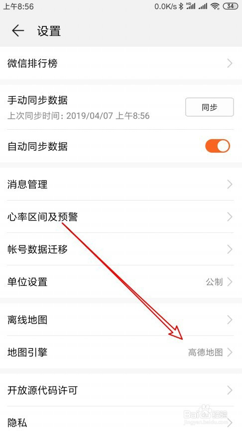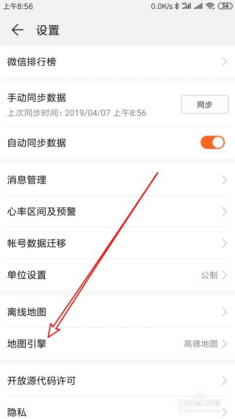 这时就会打开活动健康的设置页面,点击地图引擎的设置项。