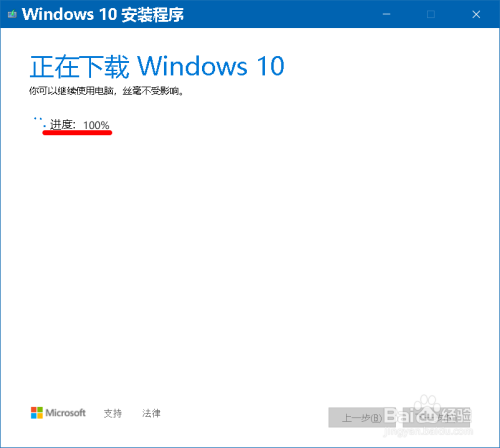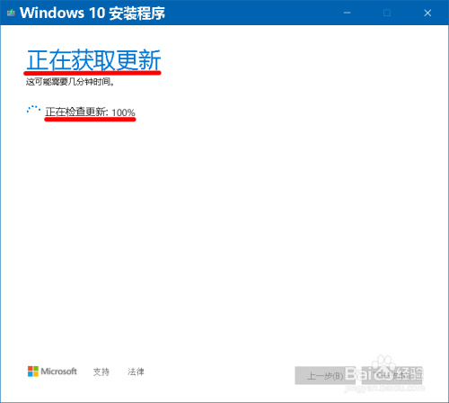接着 Windows 10安装程序 获取更新,查抄更新:100%后,点击:下一步;