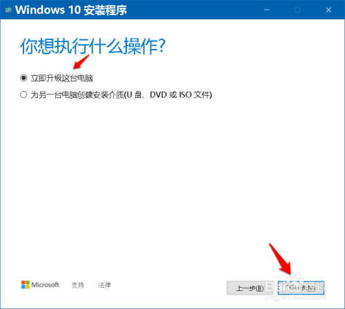 接着打开 您想执行什么操作?窗口,若是是安装Windows 10系统,则点击:当即进级这台电脑,再点击:下一步;