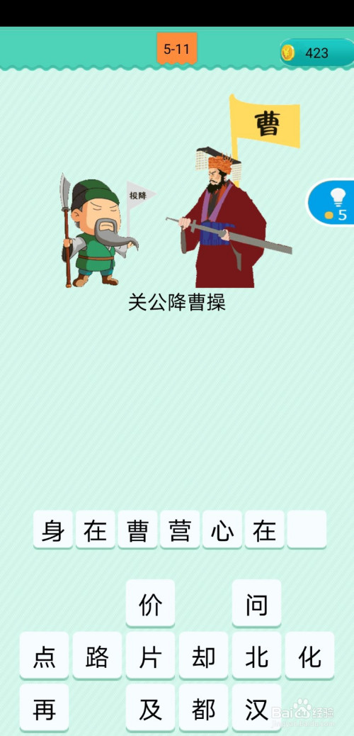 第5-11关,图中画的是关羽降服佩服了曹操,读过三国演义的都知道,此时的关羽是身在曹营心在汉,所以这也是本关的谜底;