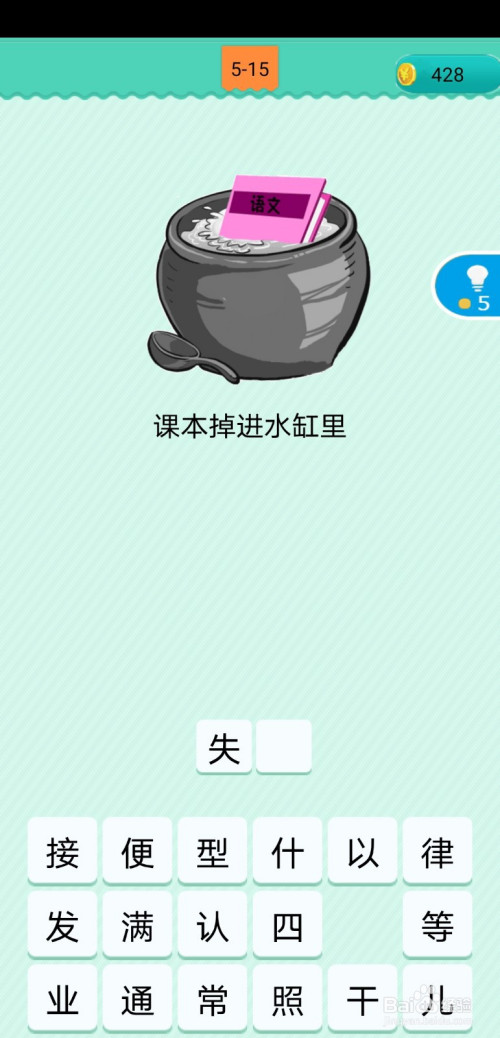 第5-15关,本关有一个洪流缸,有一本书失落了进去,水缸有水,暗示湿(掉),书本有一册一册的叫法,所以本关歇后语为讲义失落进水缸里,掉策。