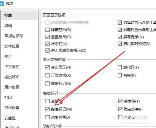 在右侧窗口中找到段落标识表记标帜的设置项,点击打消该设置项前面的复选框。