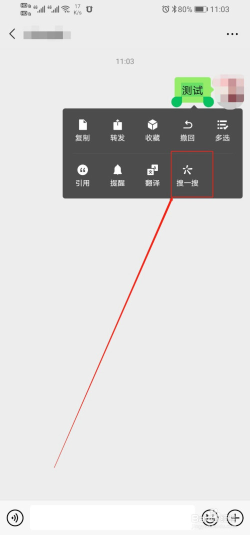 3、长按动静对话框,在之后弹出的功能办事框中选择“搜一搜”选项