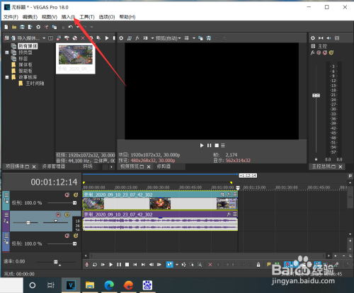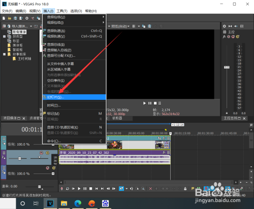 1、在Vegas打开视频后点击插入