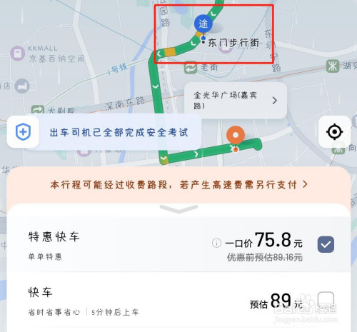 最后,您的路线预览图中就会呈现一个“途”的图标,这就代表着路过点,然后再像日常平凡叫车一样选择“快车”、“优享”、“礼橙专车”就可以了!