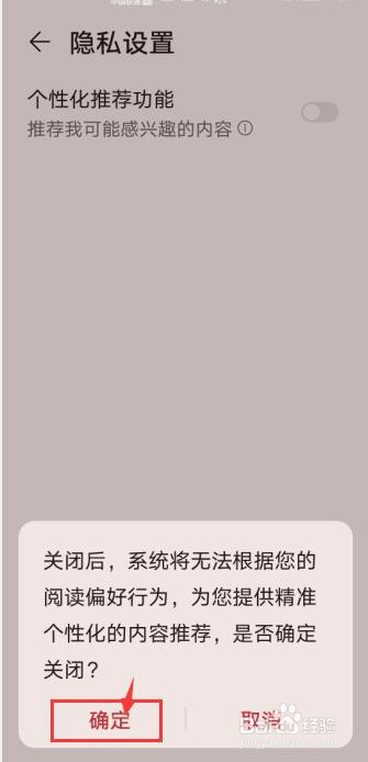 按照弹框提醒,点击【确定】即可封闭个性化保举功能。