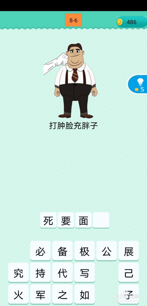 第8-6关,图片中有个胖子,被人在打脸,底部有配文字申明他之所以这么胖,是被打肿了脸,所以本关打肿脸充胖子的歇后语为死要体面。