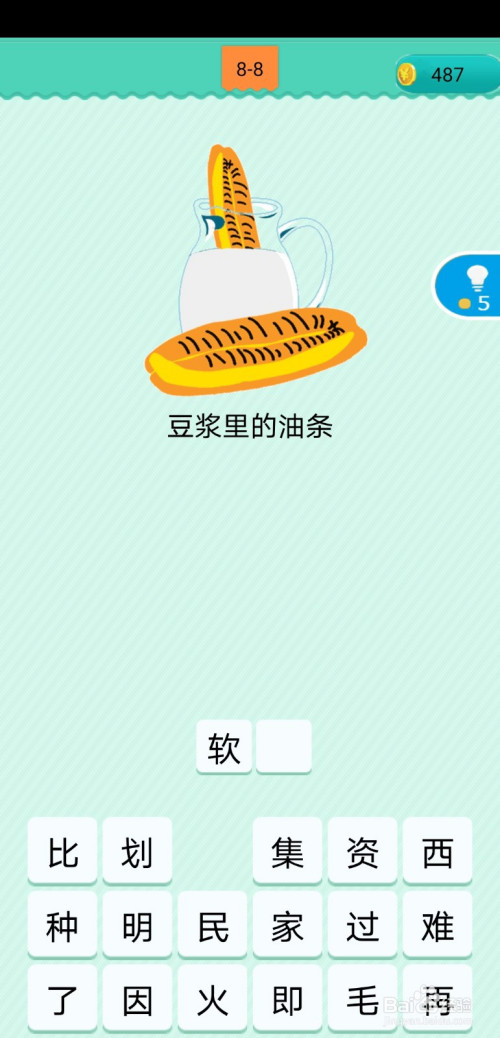 第8-8关,图中有油条和豆乳,此中一根油条泡在了豆乳里,油条泡在豆乳后,会变软,所以豆乳里的油条歇后语为软了;