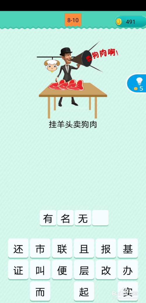 第8-10关,图片中有小我在卖肉,架子上挂着羊头,嘴里却喊着卖狗肉,所以本关歇后语为挂羊头卖狗肉,有名无实。