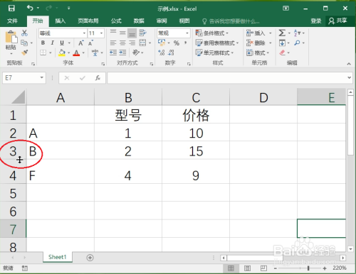 ●将光标定位到“3”的下边线上,直到光标变为双标的目的对拉箭头。