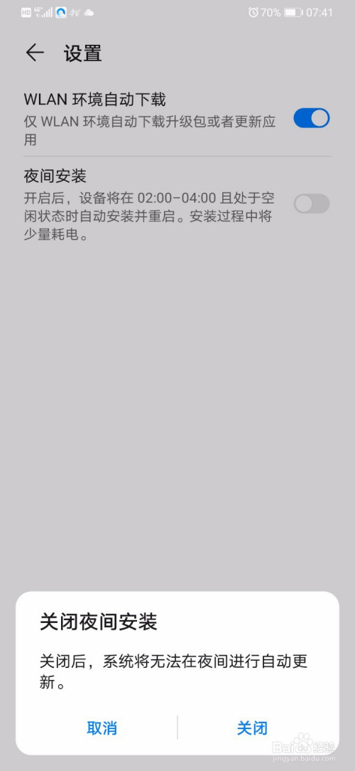 点击勾选失落一下这个开关,这时辰系统会提醒我们是否封闭夜间更新,点击封闭即可。