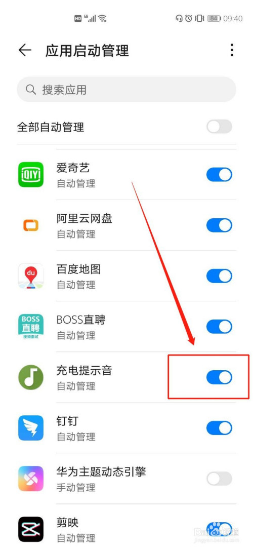 6.随后进入应用启动办理,将充电提醒音app设置为主动办理。