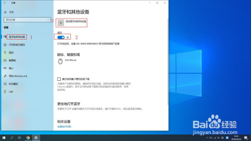 选择蓝牙和其它设备,打开蓝牙开关,点击添加蓝牙或其它设备。