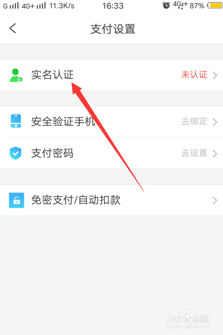 2、找到支付设置,点击实名认证。
