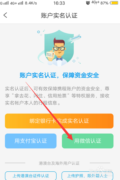 在账户实名认证里,选择用微信认证。