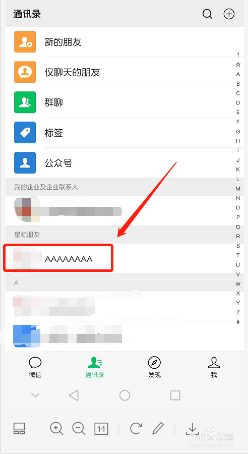 返回通信录,可以看到星标伴侣显示在通信录的前方。星标老友列表栏内呈现了适才标识的老友名称。