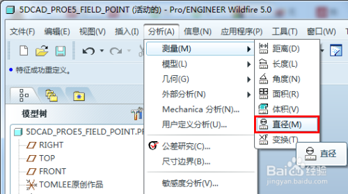 首先启动一个直径测量,指令菜单元置:阐发——测量——直径。