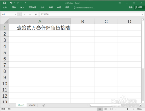 在“A1”单位格中输入数字“123456”,然后按键盘上的回车键。