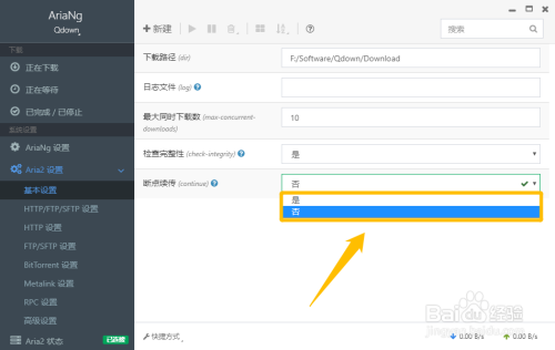 点击“断点续传”中的复选框后,在睁开的下拉框中选择“否”选项。