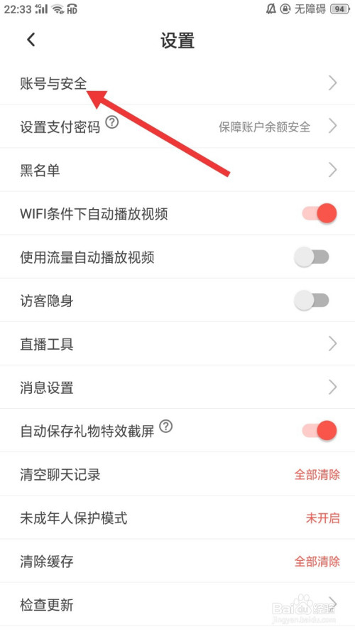 进入到设置界面后,我们再点击账户与平安选项即可。