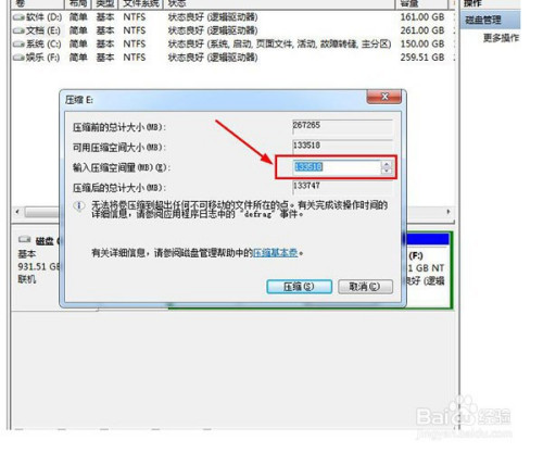 这里需要输入要压缩出来的分区大小,一般最大只能压缩出本来磁盘分区的一半。