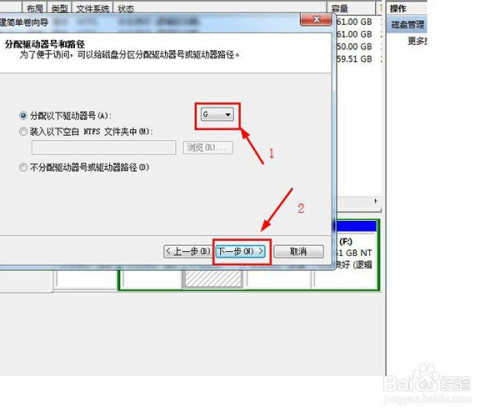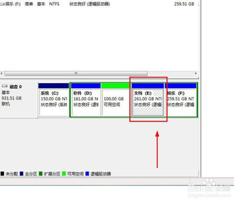 在磁盘办理中我们可以看到硬盘的分区环境,选择一个分区。(选择大一点的,文件比力少的分区。)