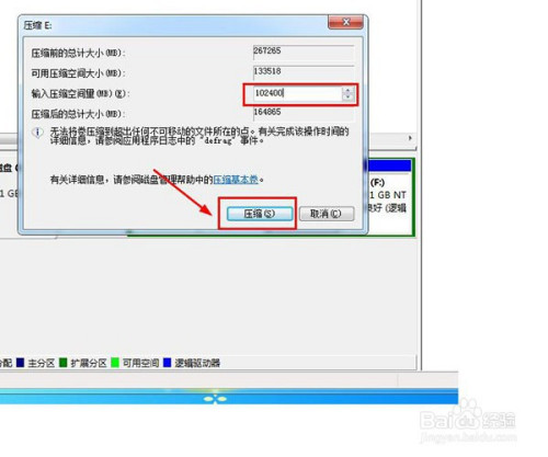 这里是压缩出100GB的空间(100*1024MB),所以输入102400,输入好数值后点击下方的“压缩”。