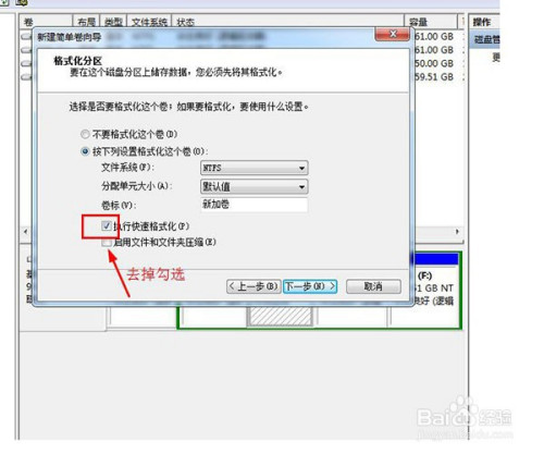 到这一步比力关头,其他的都连结默认,把这下面的“执行快速格局化”前面的勾去失落,这样格局化出来的分区犯错的几率比力小。