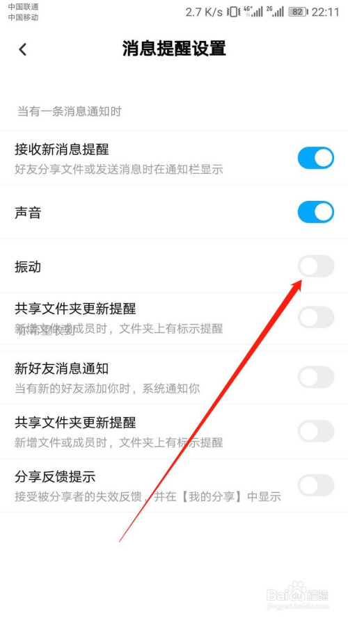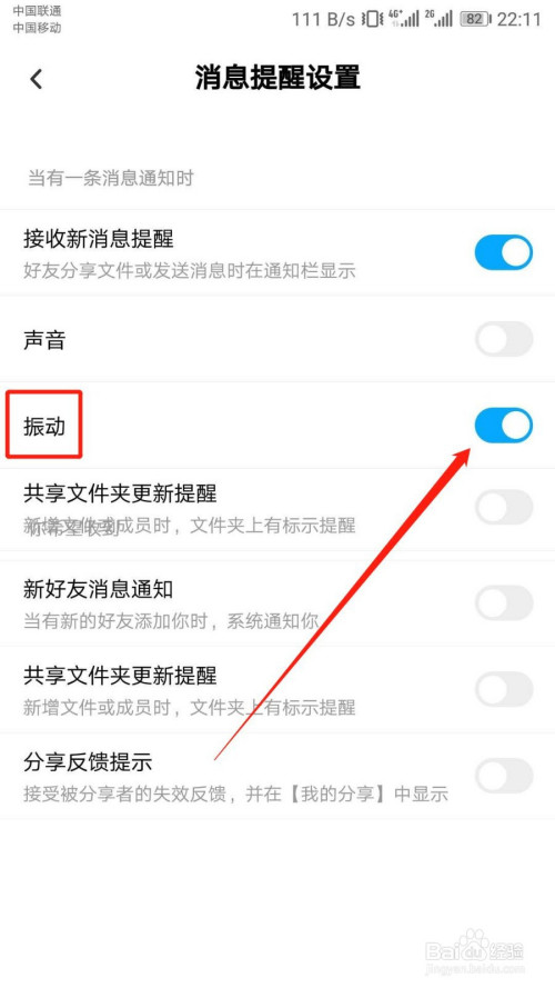 6:“动静提醒设置”页面按照指引点击“振动”开关标识。