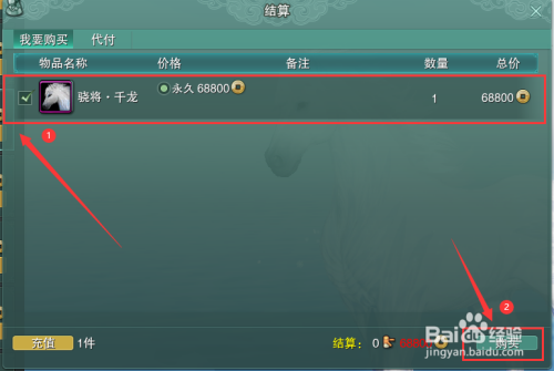 最后在打开的结算页面中,我们选中【骁将·千龙】,点击右下角【采办】按钮,这样子,我们就获得了坐骑骁将·千龙啦~