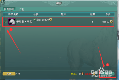 最后在打开的结算页面中,我们选中【千蛟影·肃云】,点击右下角【采办】按钮,这样子,我们就获得了坐骑千蛟影·肃云啦~