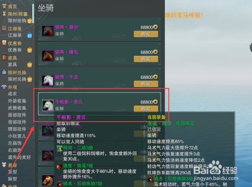 然后在坐骑栏面前目今面,左键选中【千蛟影·肃云】。