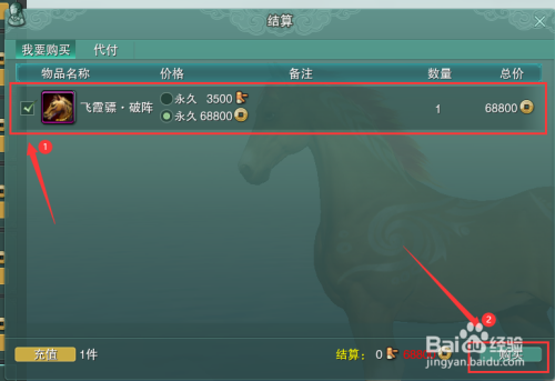 最后在打开的结算页面中,我们选中【飞霞骠·破阵】,点击右下角【采办】按钮,这样子,我们就获得了坐骑飞霞骠·破阵啦~