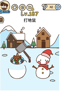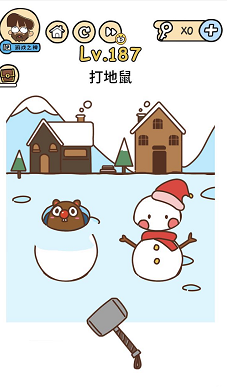 《脑洞大大大》关卡187:打地鼠。谜底操作方式:先拖动雪人到洞口上堵住,再拖动锤子到地鼠头上。
