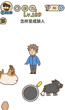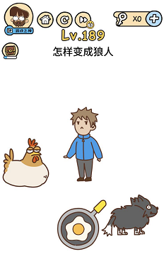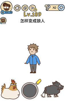 《脑洞大大大》关卡189:如何酿成狼人。谜底操作方式:按住并摆布摇摆母鸡,会失落下来一个鸡蛋。将鸡蛋拖到平底锅里会酿成煎蛋,再将蛋黄拖到人物头顶上。