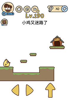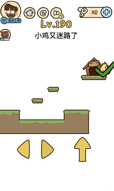 《脑洞大大大》关卡190:小鸡又迷路了。谜底操作方式:按住右边偏向键让小鸡一向往右走,然后跳上一个小台阶继续往右走,失落入绝壁后会落到上方斗室子上。
