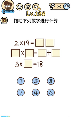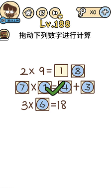 《脑洞大大大》关卡188:拖动下面数字进行计较。谜底操作方式:第一个式子的数字1可以拖动,所以从上到下的公式是2×9=18、1×7=3+4、3×6=18.