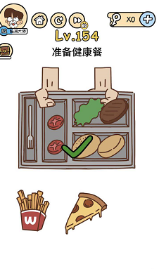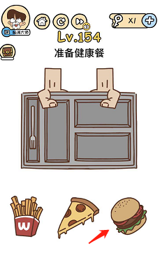 《脑洞大大大》关卡154:筹办健康餐;谜底操作方式:手指按住汉堡拖到餐盘上方骇猴快速摆布滑动,将汉堡 分手。