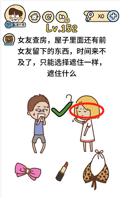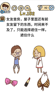《脑洞大大大》关卡152:女友查房,房子里面还有前女友留下的工具,时候来不及了,只能选择遮住一样,遮住什么呢?谜底【遮住女友的眼睛】操作方式:用您的手指头遮住图中女孩的眼睛就可以了。