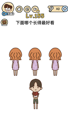 《脑洞大大大》关卡155:下面哪个长的最都雅?谜底【最右边的女孩】,可以让捧开花的男孩站到女孩前面去看,当看到最都雅的女孩时,捧花的男孩脸上会害羞。