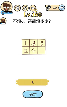 《脑洞大大大》关卡180:不填6,还能填几多?谜底【8】。1+1+3=5,2+4+2=8.